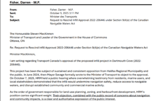 Email sent October 9th, 2025 - CLICK FOR COPY OF ORIGINAL EMAIL The Honourable Steven MacKinnon Minister of Transport and Leader of the Government in the House of Commons Ottawa, ON Re: Request to Rescind Infill Approval 2022-206446 under Section 9(4)(e) of the Canadian Navigable Waters Act Minister MacKinnon, I am writing regarding Transport [...]