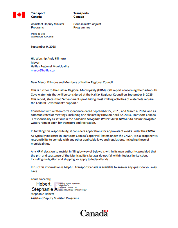 In response to concerns raised in HRM’s staff report on Dartmouth Cove, Transport Canada wrote directly to Mayor Fillmore and all members of Council. Their letter reiterates previous conversations about federal jurisdiction and emphasizes that HRM has the authority to adopt bylaws to further restrict infilling in Halifax Harbour.