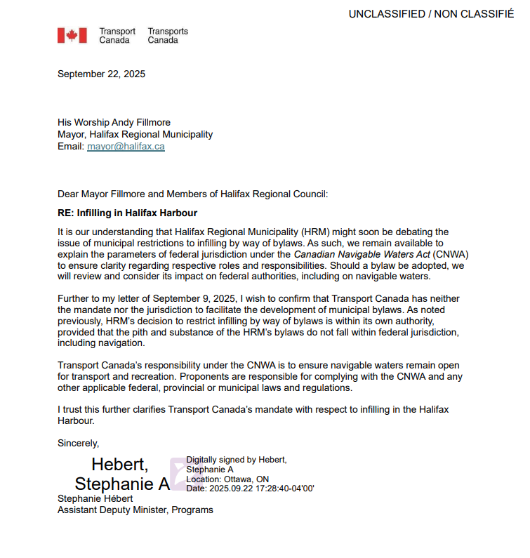 I continue to personally disagree with Transport Canada’s decision on this. However, as mentioned above, the approval explicitly states that any infill would still be subject to all other applicable laws and regulations—like HRM’s by-law. Transport Canada’s role is limited to navigation, which is precisely why HRM’s by-law is so important to fill the regulatory gap.