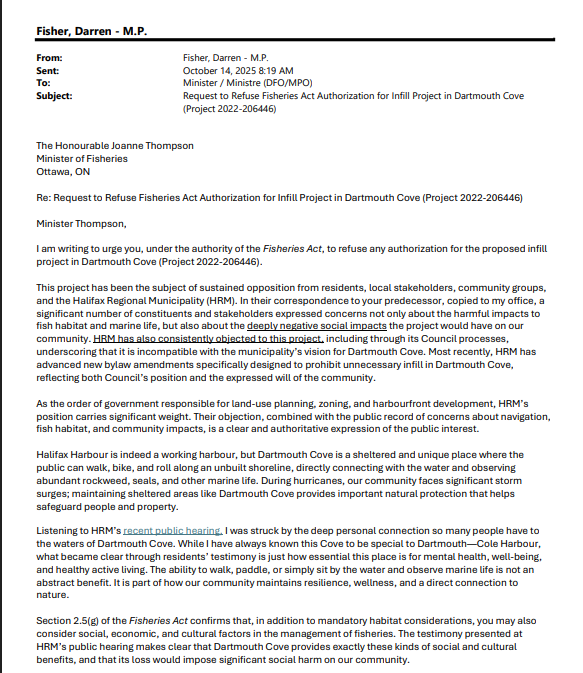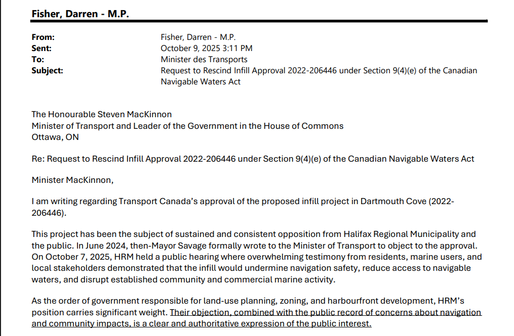 As promised, I’ve reached out to my own provincial MLA, Minister Tim Halman, and asked him—as a Dartmouth MLA and a member of the provincial Cabinet—to take a close look at this issue, use his voice to advocate for Dartmouth Cove, and push for what’s right.