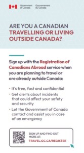 If you are travelling outside Canada, whether for vacation, work, or living abroad, make sure you register with the Government of Canada’s Registration of Canadians Abroad service.